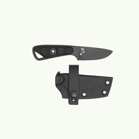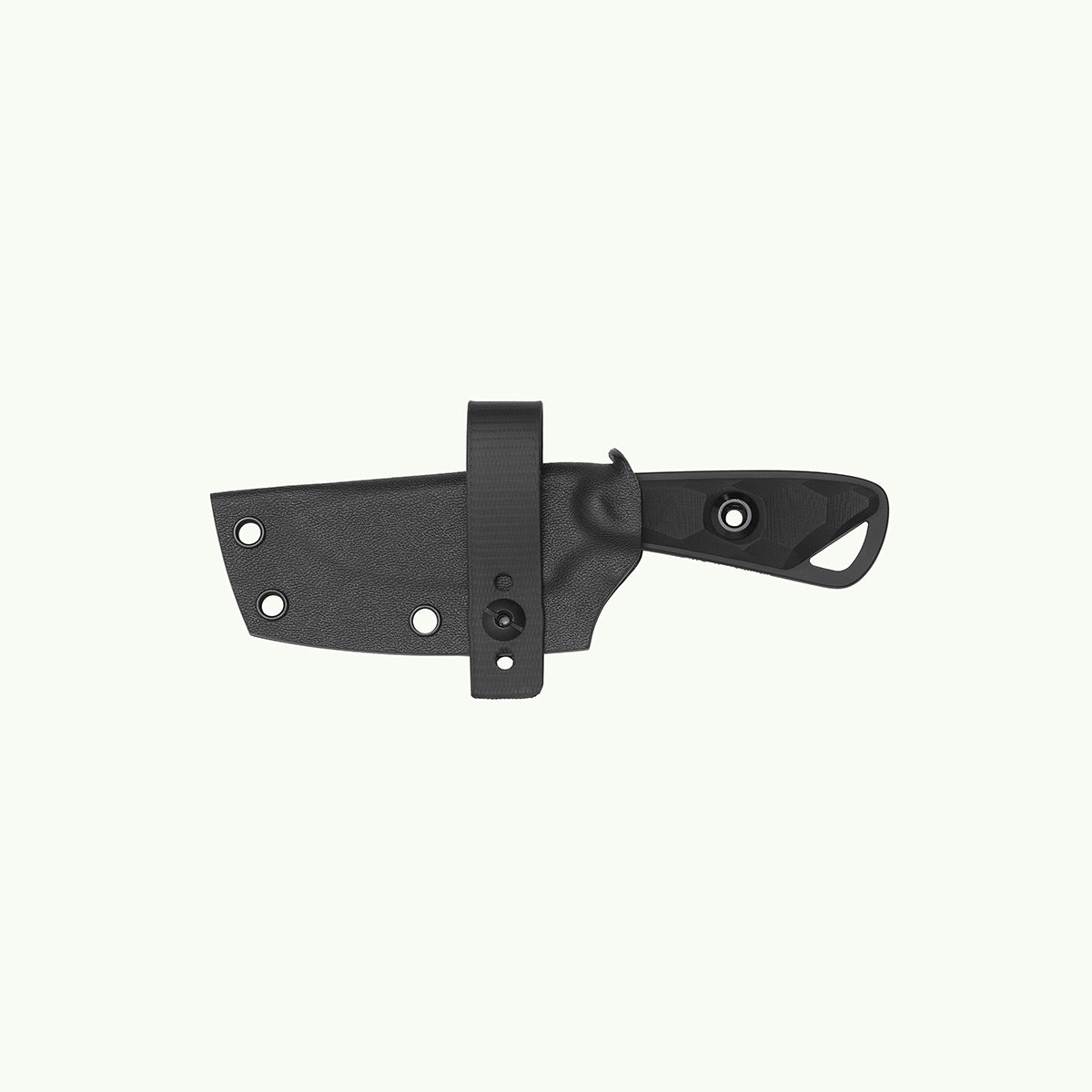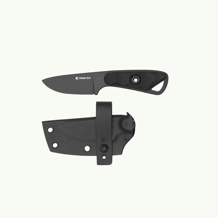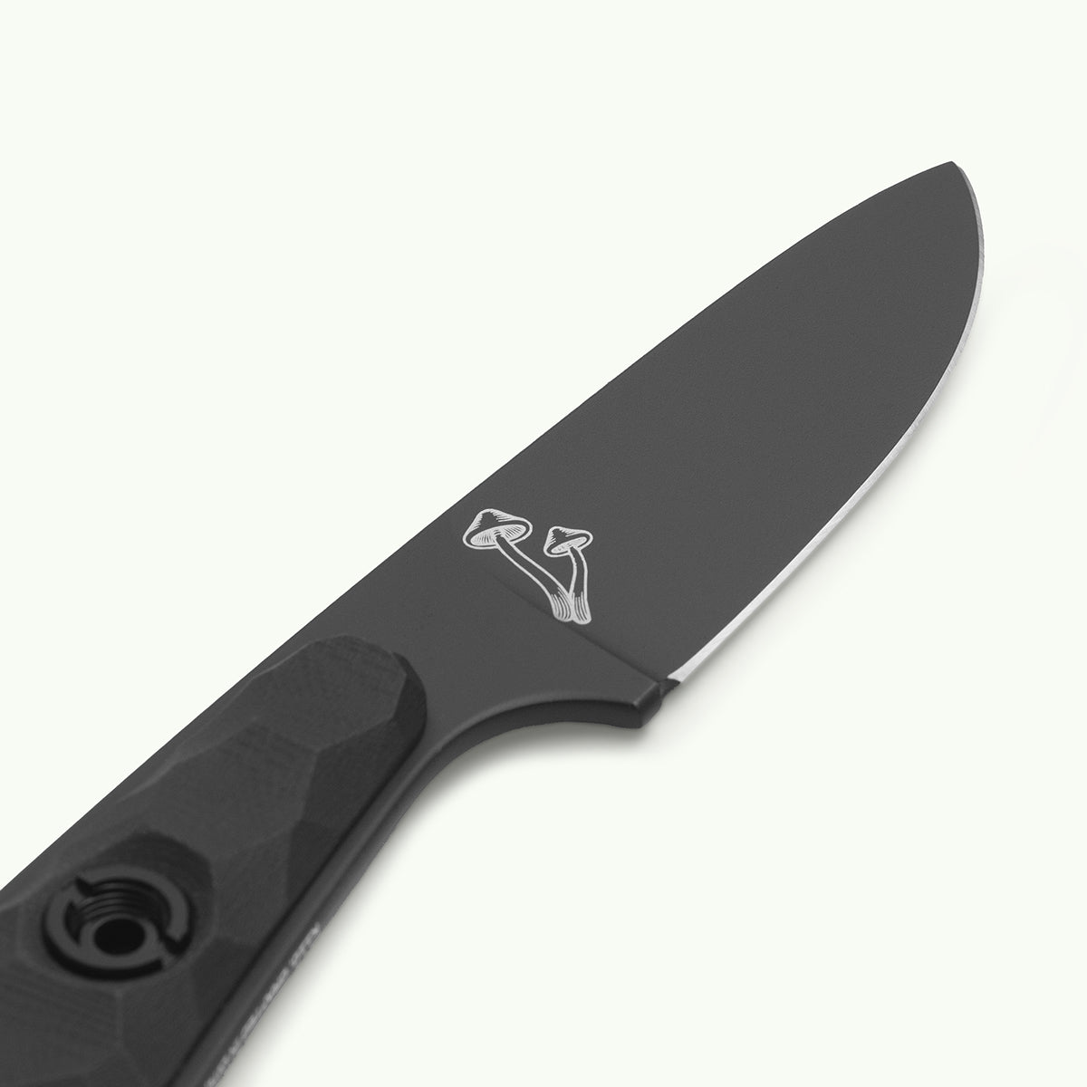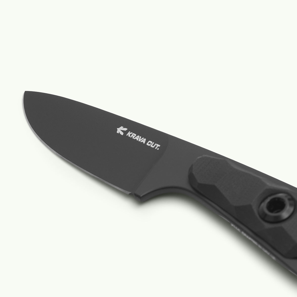 The metal part of the knife is covered with " Cerakote " black paint, a ceramic coating used to protect surfaces from wear, corrosion, and chemical influences. Minimalist Krava Cut logo. and toadstool mushroom. The titanium bolt is custom-made and, if necessary, you can tighten it with a coin in your pocket. The knife is ideal for everyday use, its size and minimalist design do not attract unnecessary attention.