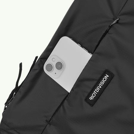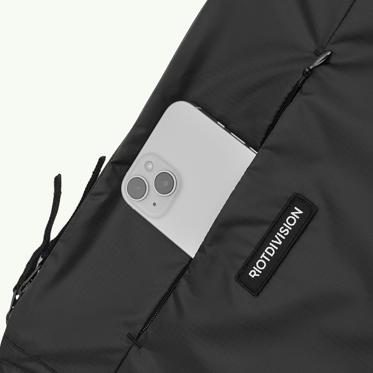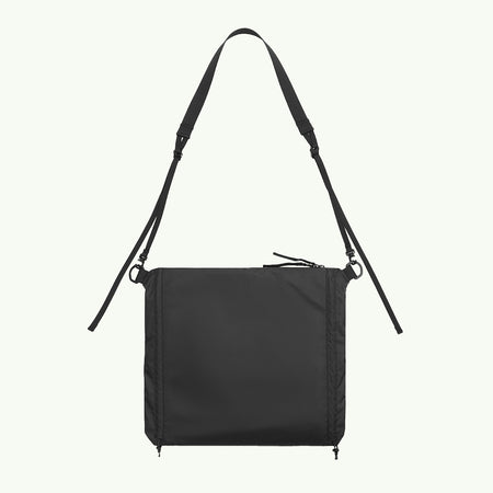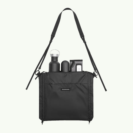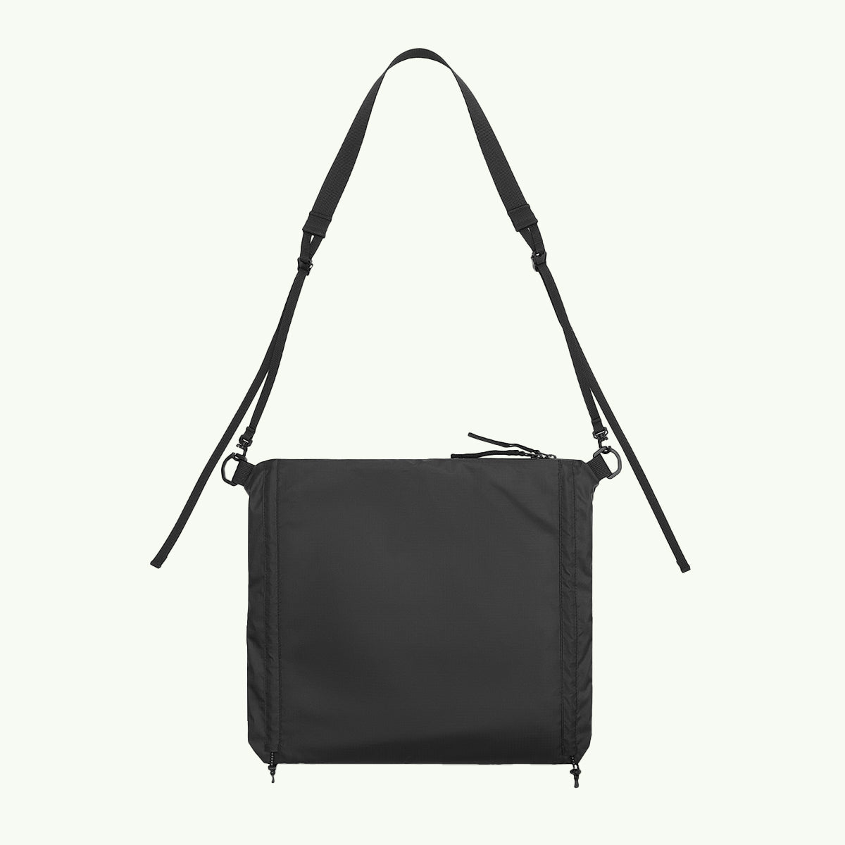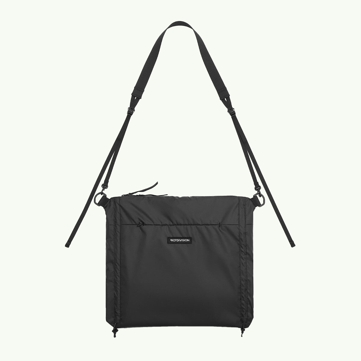 A shoulder bag made of ultra-light ripstop nylon with a water-repellent coating. Can be reduced in volume thanks to elastic cords on the sides of the bag