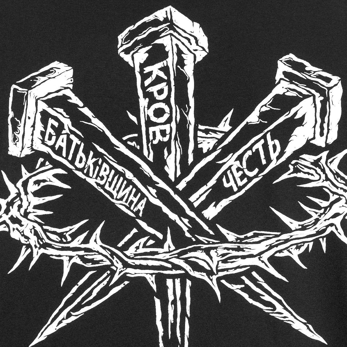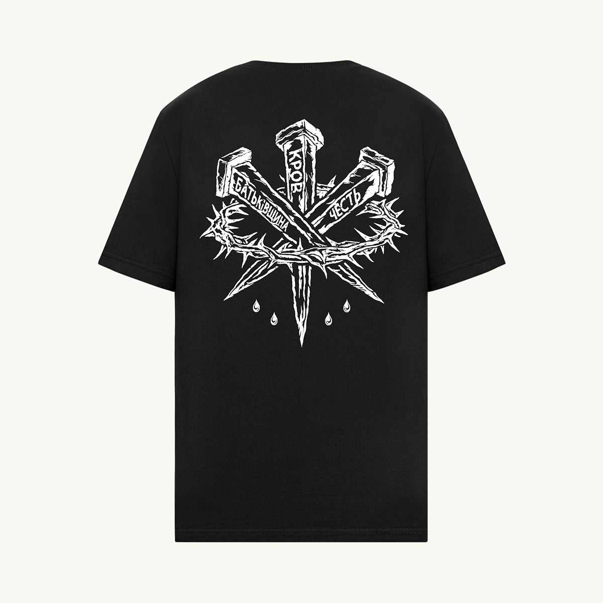 This T-shirt is like a black prayer and a cry at the same time. On three nails, like a cross of memory, the words are engraved: "Homeland", "Blood", "Honor". A crown of thorns wraps around them, reminding of pain, sacrifice and indomitability.
