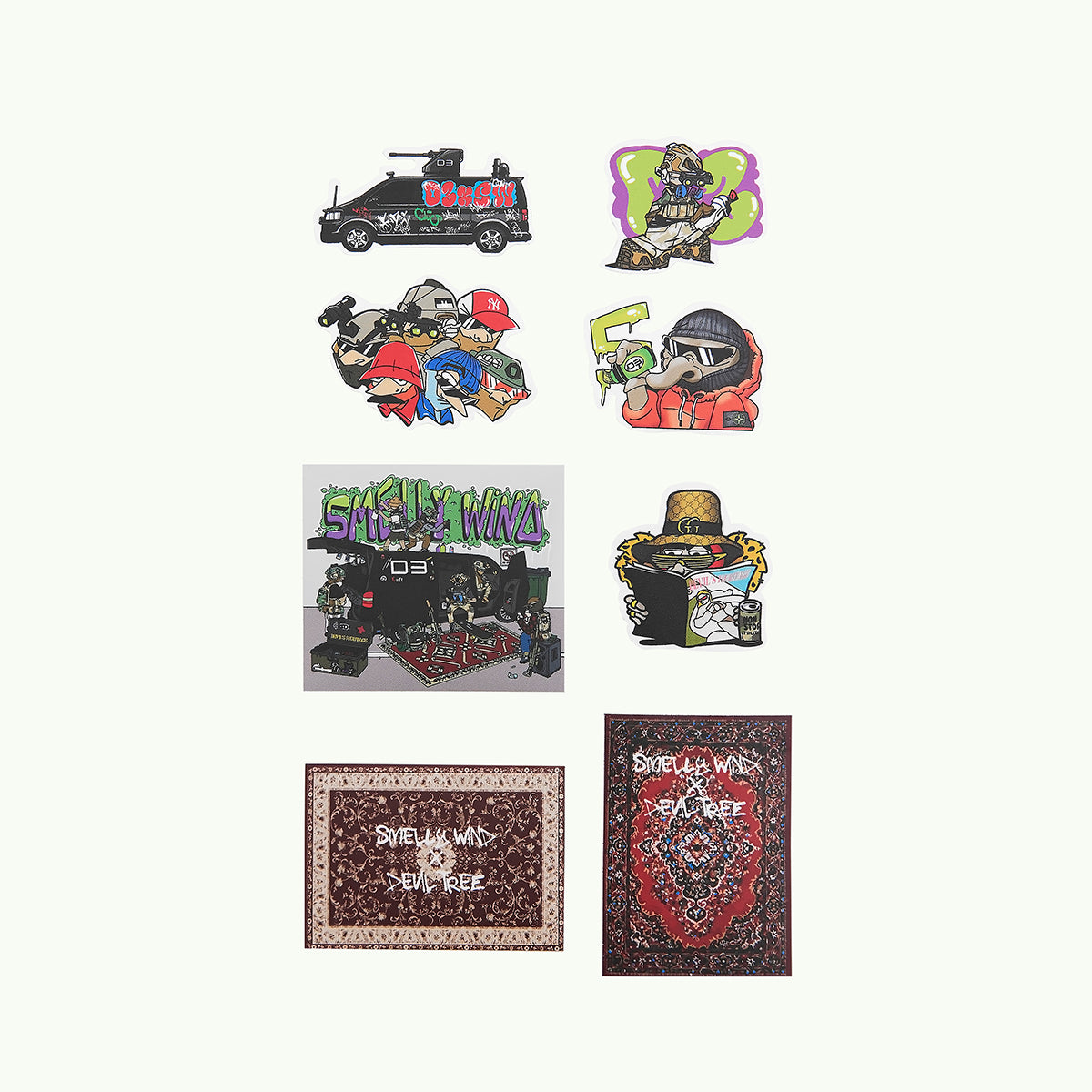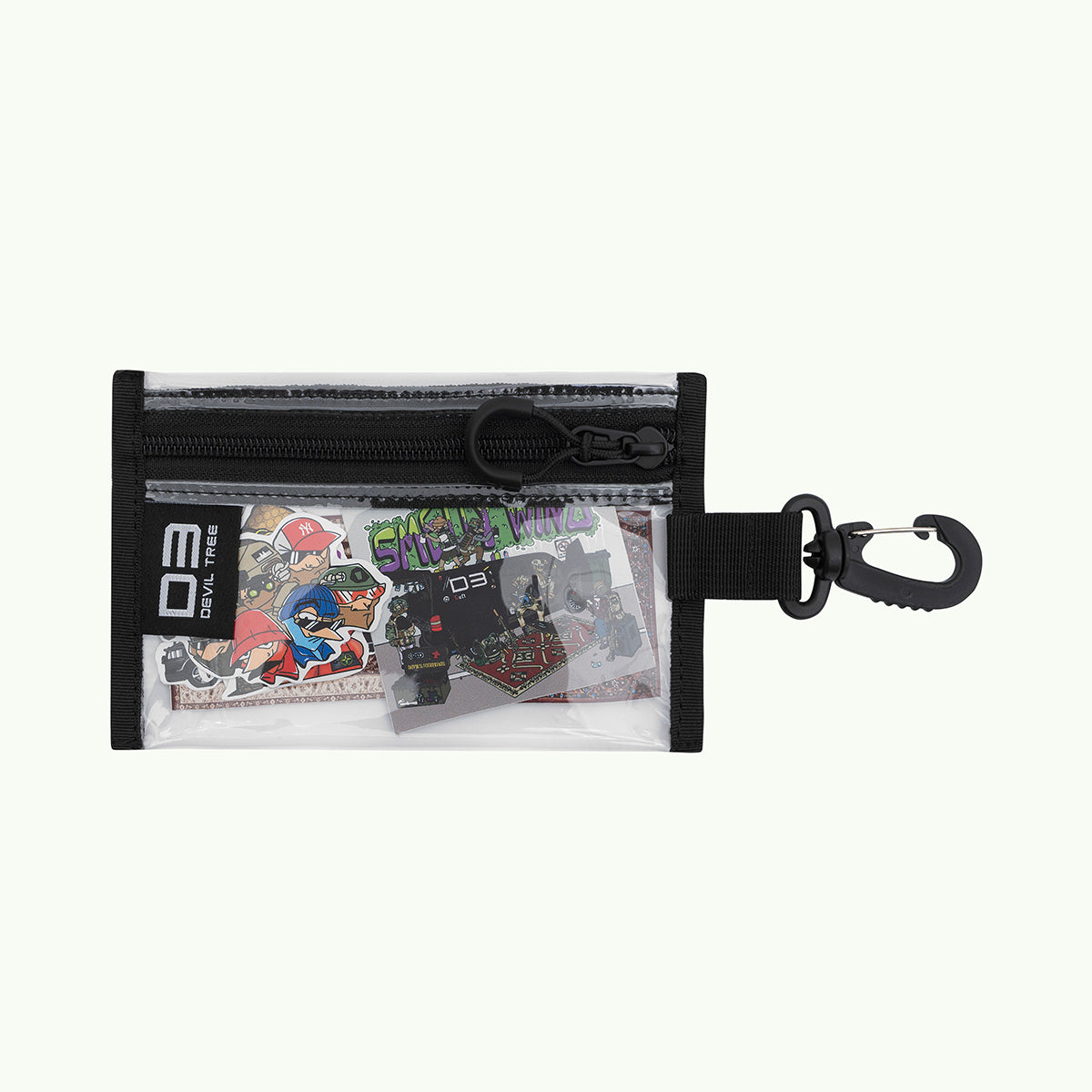 Яскравий набір стікерів з творчими роботами нашого художника, на стику вуличної та мілітарної культури. І за традицією, упаковка — це функціональний мішечок на карабіні, на цей раз — з прозорого матеріалу.