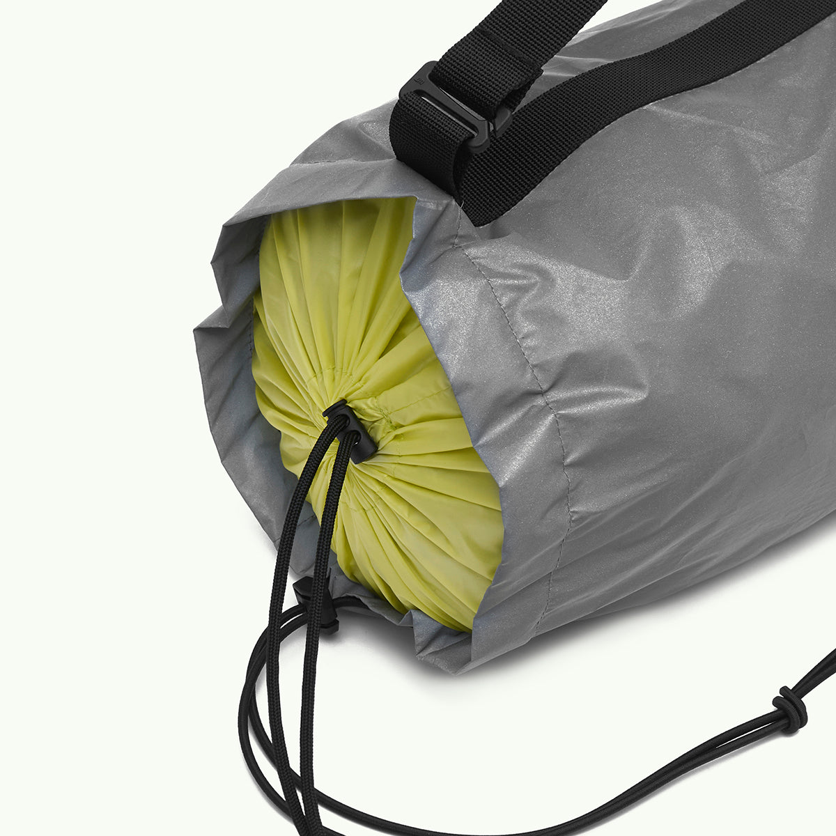 Чохол із переробленого, рефлективного та вологозахисного матеріалу. Силует та місткість чохла дозволяють зберігати та переносити килим для йоги та особисті речі, штатив для камери, тощо. При перенесенні килимків в сумці залишається місце, щоб покласти рушник або змінний одяг. Додаткові фіксатори надають змогу регулювати довжину ручки та ширину чохла залежно від вмісту.