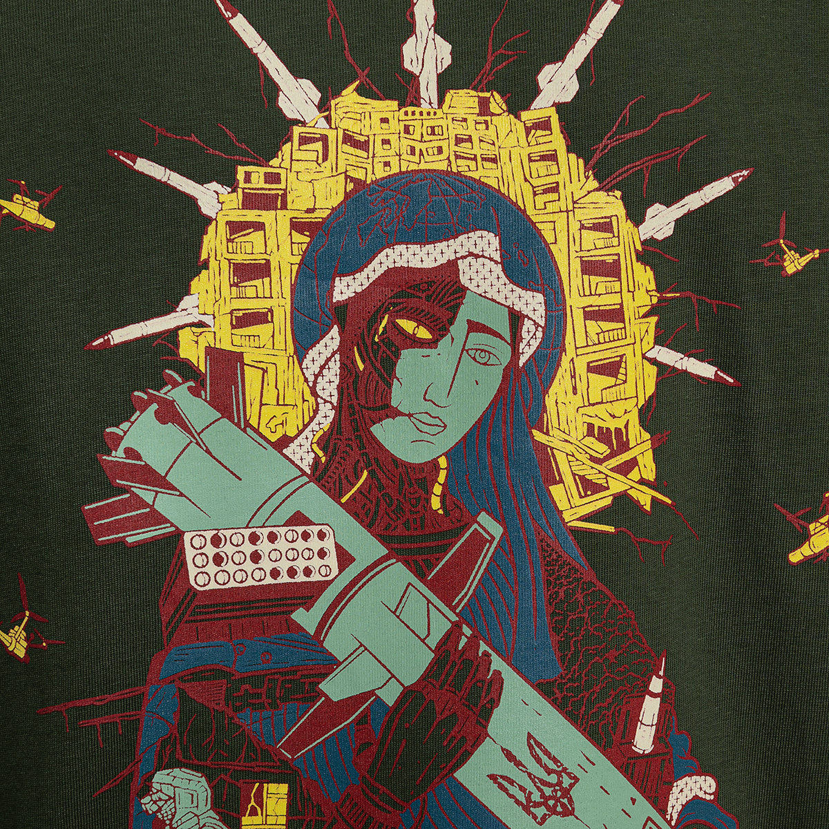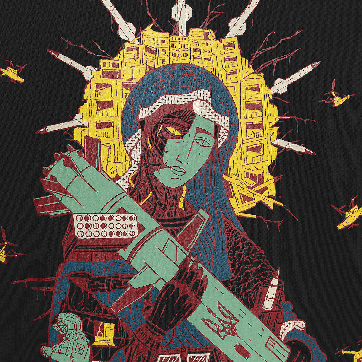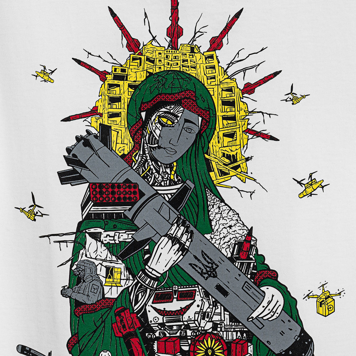 Створена талановитим українським художником та ілюстратором Олегом Семаком, ця версія класичного зображення Saint Javelin багата на символічні елементи, що втілюють суть того, за що виступає бренд. Навколо центральної фігури Saint Javelin зображені потужні ікони стійкості та захисту: солдати, військові медики та волонтери. Кожен елемент дизайну розповідає історію мужності, жертовності та непохитної підтримки боротьби України за свободу.